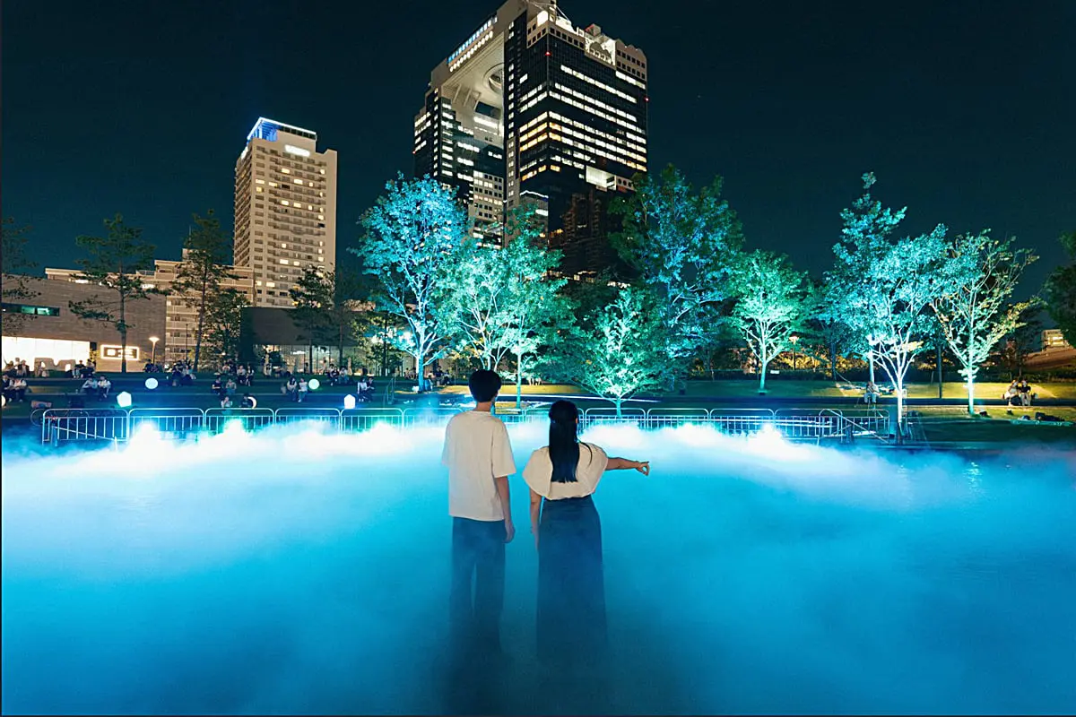 夜間にはライトアップによって、より幻想的な空間へと変身。霧・光・音が織りなす世界で没入体験ができます。