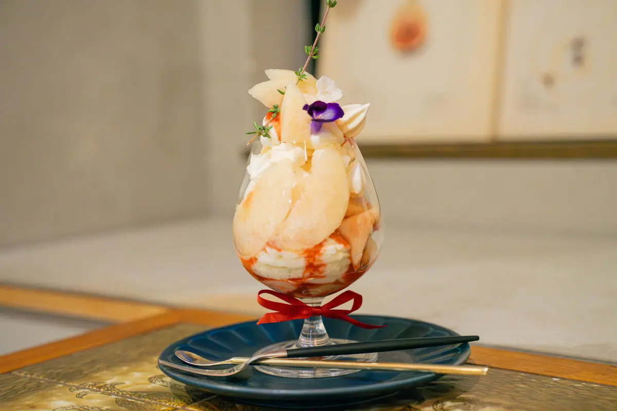 夏の間は「白桃のイートンメス」が登場。新鮮な国産白桃をたっぷり盛り込みつつ、自家製のメレンゲクッキーとクリームに、自家製いちごソースでアクセントを加えます。下部に巻かれたリボンもとっても可愛いです。