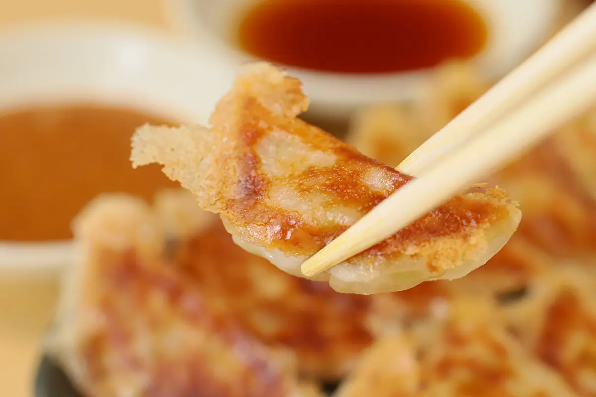 「餃子歩兵」の餃子の特徴は、パリっとした薄皮とジューシーな餡のバランスの良さ。特注品の極薄の皮で豚肉・白菜・キャベツのシンプルな餡を包み、繊細な技術を要する焼き加減で作られる焼き餃子です。にんにく・にらの有無で2種類がラインアップしています。