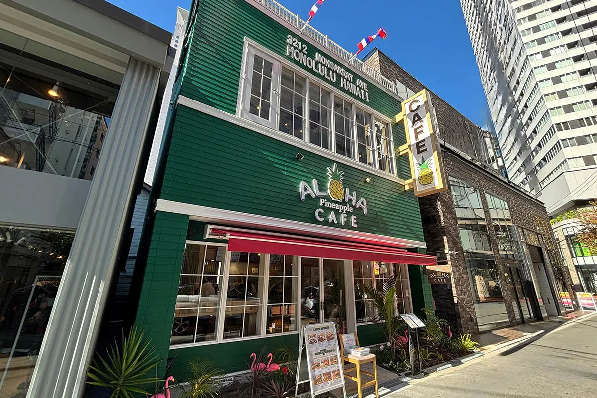 鮮やかなグリーンと店名にちなんだパイナップルが目をひく店舗は、まるでハワイを訪れたような気分に。阪急「大阪梅田駅」から徒歩3分というアクセスのよさも魅力です。