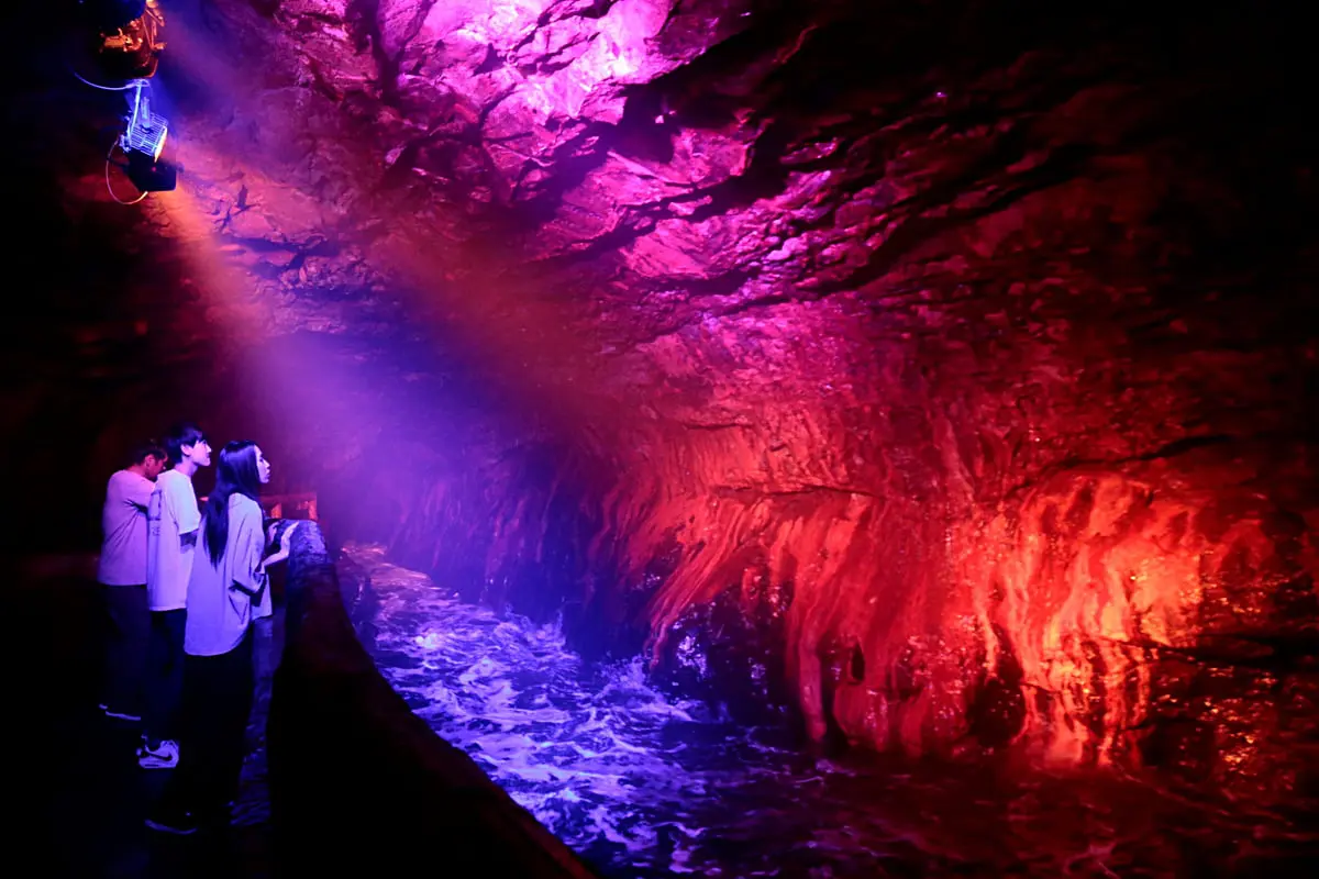 洞窟内の展望台では、ライトアップされた岩肌や波によって、夜の洞窟の神秘的な雰囲気を演出。日中とは違った洞窟体験が楽しめます。