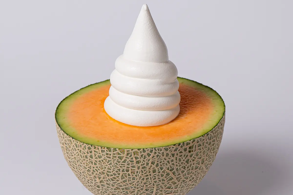 「らいでんメロン」半玉を器に見立てた、果肉とソフトクリーム両方が味わえるスイーツ。糖度がアップする秋ならではの濃厚な甘みが楽しめます。