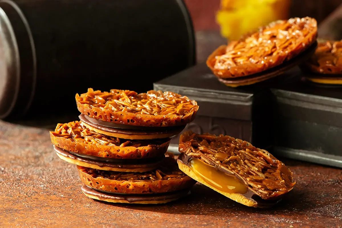 ミルクチョコレートと、さつま芋・バター・生クリームを合わせて炊き上げた「スイートポテトキャラメル」を、華やかな甘みのアーモンドフロランタンとバターサブレでサンド。