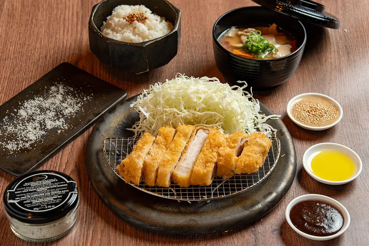 「豚ロースかつ」は、外側はサクッと軽やかな衣、中はミディアムレアに仕上げられたロース肉がしっとり柔らか。噛むたびに肉汁がじゅわっとあふれます。特製ソースや胡麻ダレ、塩を合わせて、味わいの変化もぜひ楽しんでみて。