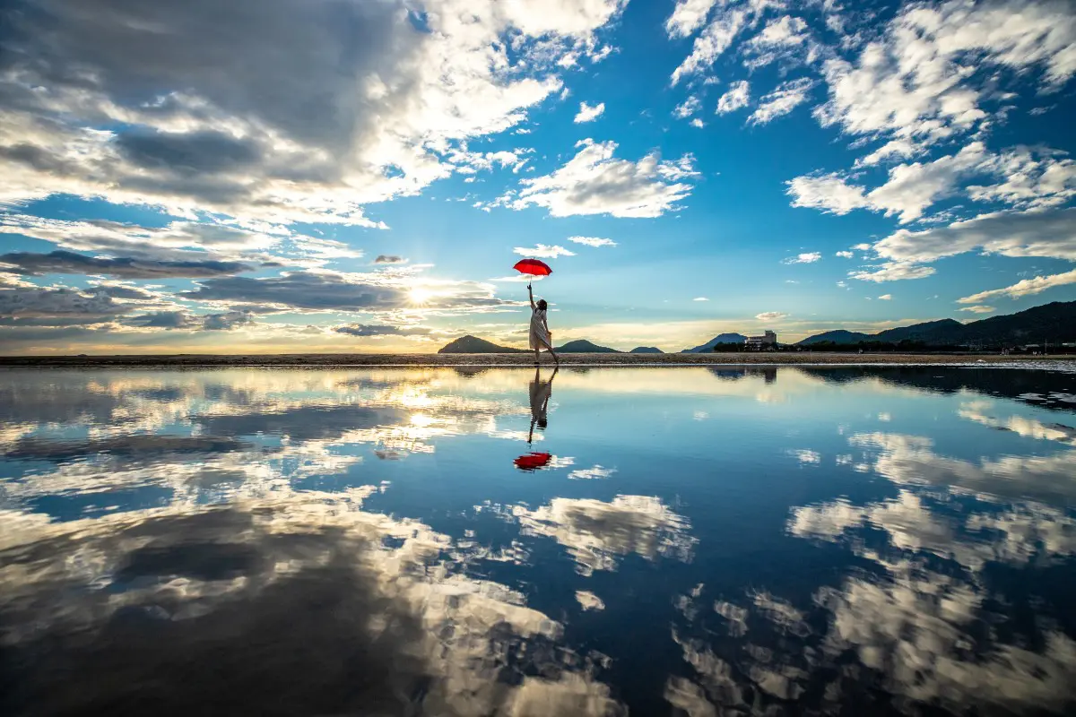 香川県を代表するフォトジェニックスポット「父母ヶ浜」(香川県三豊市仁尾町仁尾乙)は、約1kmにわたる遠浅の穏やかな砂浜。干潮時には潮だまりに周囲の景色が鏡のように映り込み、“日本のウユニ塩湖”とも称される絶景が広がります。特に、日の入り前後30分間のマジックアワーには幻想的な光景が楽しめ、SNS映えスポットとしても人気です。周辺には絶景を眺めながら食事やカフェタイムを楽しめる施設もあり、自然美とくつろぎを同時に堪能できるパワーチャージスポットです。