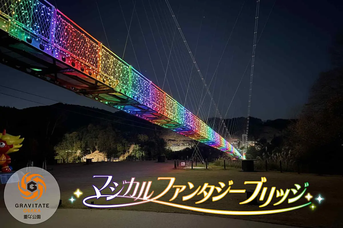 2025年12月24日(水)~2026年2月28日(土)まで、「GRAVITATE OSAKA(グラビテート オオサカ)」(大阪府茨木市生保)の歩行者専用吊り橋「GODA BRIDGE(ゴウダブリッジ)」が7色のイルミネーションで彩られる「マジカル・ファンタジー・ブリッジ」が開催されます。