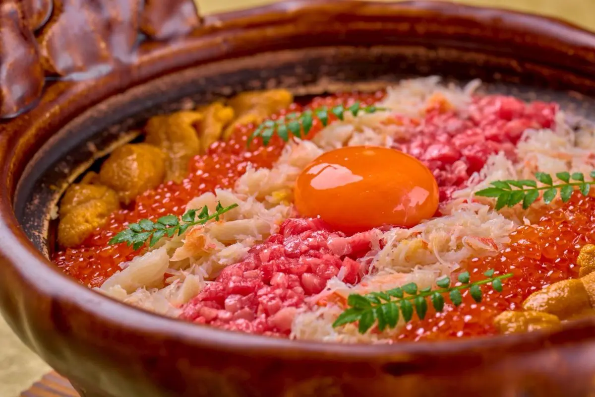 系列店で人気の一品として知られる「究極のうしみつ飯 〜和牛・雲丹・蟹・いくら〜」では、山の幸と海の幸が一度に味わえます。それぞれの素材が互いの風味を引き立て合うのはもちろん、食べ進めるごとに変化する食感や味わいも魅力です。