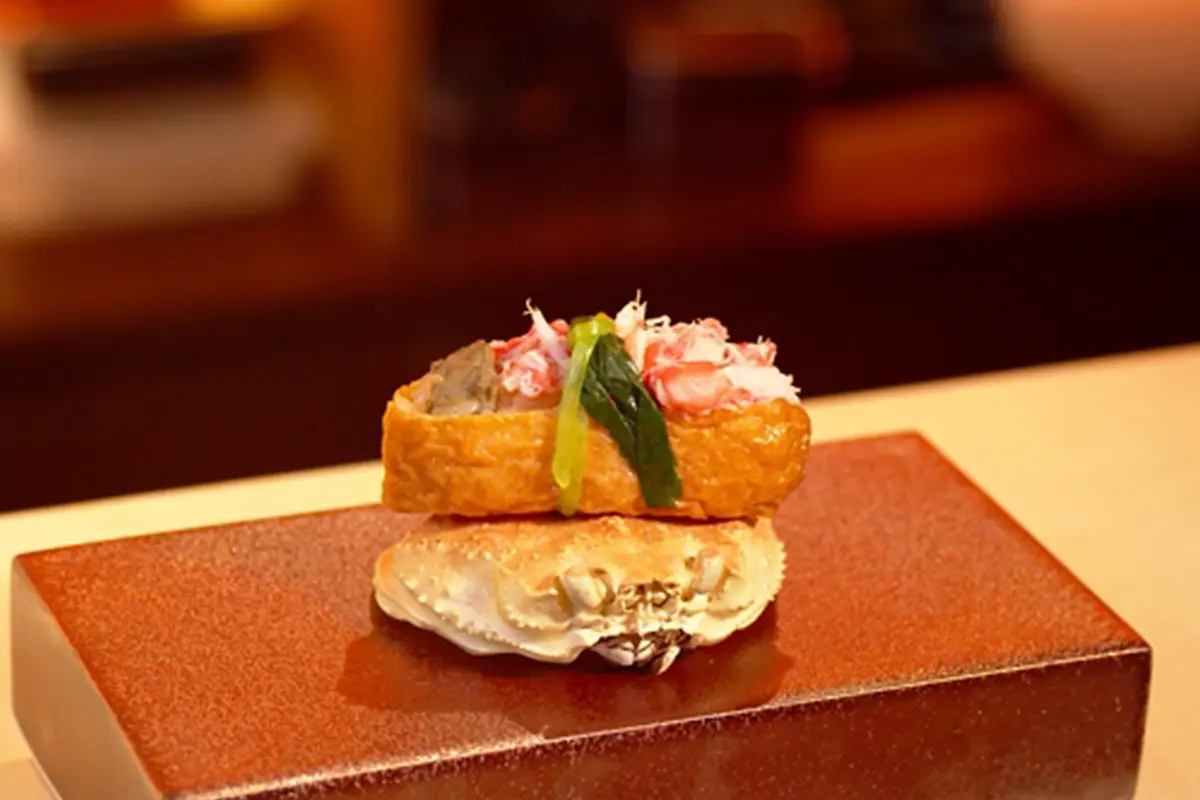 一般的ないなり寿司とは逆に、酢飯を揚げに詰め、その上に蟹などの具材をあふれんばかりに載せた見た目は食欲をそそります。一口食べれば、酢飯と具材の旨みが一体となって広がり、贅沢な味わいが楽しめます。